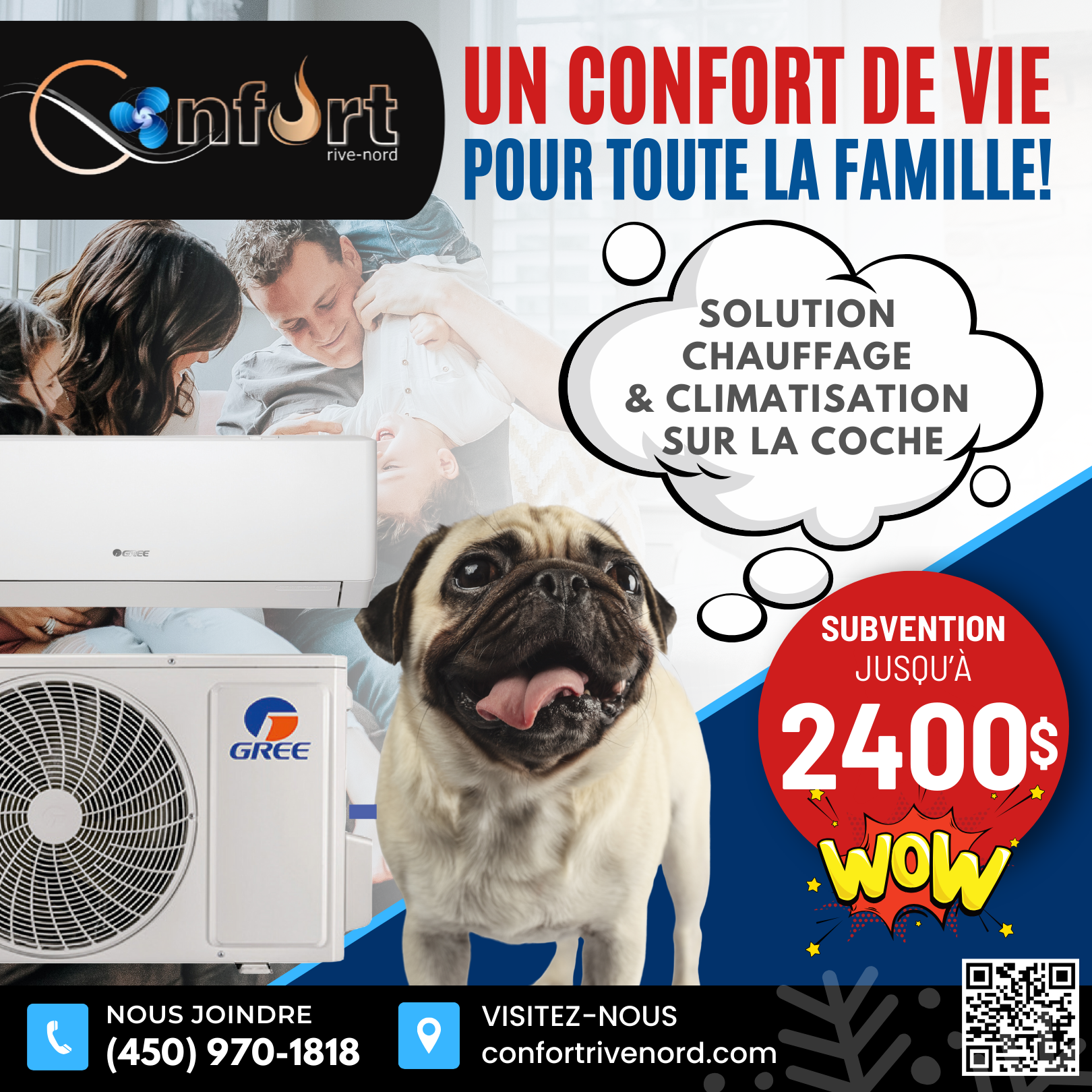Chez Confort Rive Nord, nous vous facilitons l'accès au confort de qualité, tout en vous aidant à économiser. Consultez nos promotions actuelles et contactez-nous pour en savoir plus sur les subventions et incitatifs disponibles. Nous sommes là pour vous offrir le meilleur confort tout en respectant votre budget.